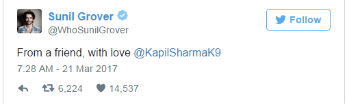 But, last night when Kapil Sharma again apologized to him on his twitter handle. He wrote: “Paji @WhoSunilGrover sry if I hurt u unintentionally.u knw vry well how much I luv u. M also upset .love n regards always:)
